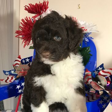 The Newfypoo combines the best of both breeds. We have Chocolate pups and Black pups and some puppies have. Estimate size is 70-120 lbs.